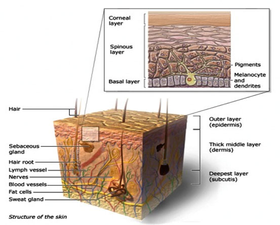 Melanin: The major aspect determining the colour of the skin is a pigment called melanin, which is present in packets called melanosomes, which are found within specialised cells known as melanocytes, that are present in the skin’s cell producing layer (also known as the basal layer).